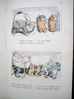 When I first browsed through the book, I was completely stumped by the German and could not understand a word of the poetry. However, Busch’s color art is so vivid and alive, and appears so precisely at key moments in the Tricks, that a very clear understanding of the narrative can be obtained simply by scanning over the illustrations.